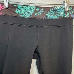 Lululemon Pants Black Cropped Leggings Floral Waist Band Yoga Running Logo Sz 4