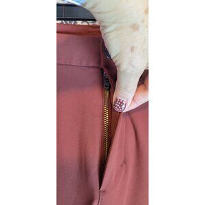 The product is a pair of Lululemon men's pants in a size 32x31, featuring a slim fit and stretch material for added comfort and flexibility. The pants are in a stylish brown color with a solid pattern, suitable for various occasions such as travel, weddings, parties, casual outings, and formal events. They have a zip closure, mid-rise waist, 5-pocket design, and are machine washable for easy care. The pants also have moisture-wicking features and are made of polyester material, making them a versatile and practical choice for the modern man.This item is in good condition, it does not have a size or composition tag.
