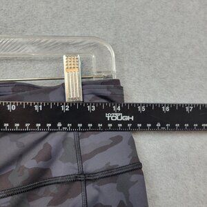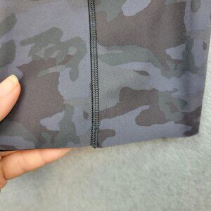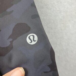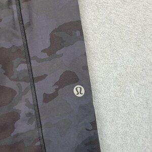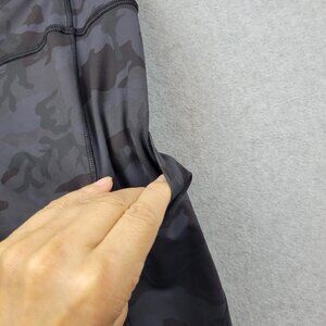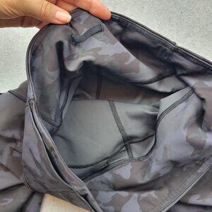 Black and gray camo print. High rise style with two side pockets. Lululemon reflective logo at lower left leg. Inner waistband features drawcord loop. Size dot inside pocket reads 10.