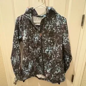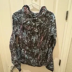 Stylish black and blue patterned jacket with a zip-up front and hood.
