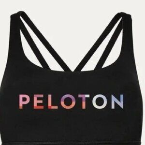Black bra featuring a vibrant Peloton logo. Stylish double strap design.