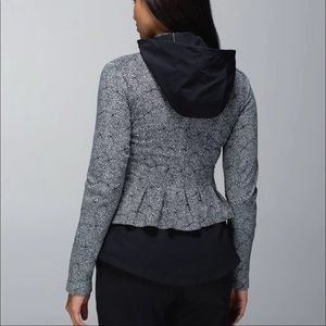In nearly perfect condition, this peplum jacket is perfect for every season. Double zipper provided for loose or more fitted application, removable hood with reflective details, cute peplum back that is flattering and formal, zipper detail on the wrists, can easily be worn for both exercising and daily life!