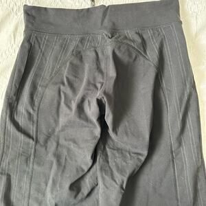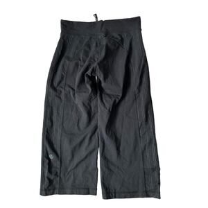 Black wide leg yoga Capri with a pin stripe rear accent saddle.