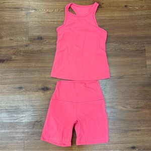 Excellent condition, like new pink Lululemon set. Worn twice! Size 4 biker shorts and size 6 top. Tag is removed from top but measurements included. Perfect for workouts or casual wear.