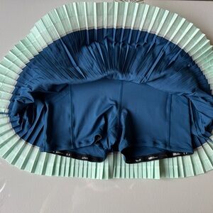Lululemon women’s athletic wear anywhere pleated mini skirt with pocketed shorts line designed for active to street wear. Color blocked “Poseidon Sea Mist” blue and mint features a pull on with signature 3 pocket waist with continuous drawstring for comfortable fit for tennis, dance, running, golf or active wear.