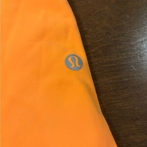 Bright orange high-waisted leggings by Lululemon. Perfect for workouts or casual wear. 25”