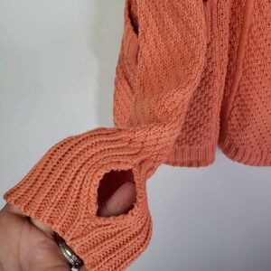 Key features: peach baggy cardigan, thumbholes, snap front, flat pockets, wide collar with a v-neckline