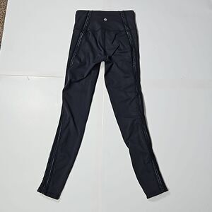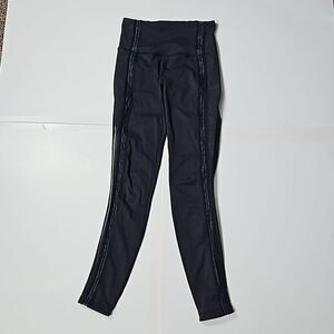 Black/ Meisai ice grey black everlux. Black high waisted full length leggings with white dotted side panels and mesh/lattice overlay and hidden waist band pocket. Great condition. Pants measure approximately 12" across top of waist band, 30" inseam and 9.5" rise.