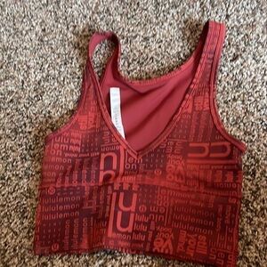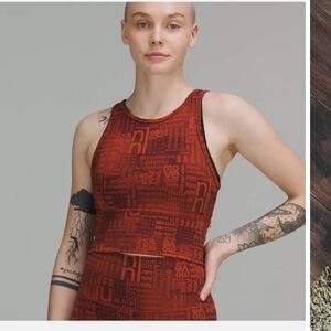Lululemon Power Pivot Everlux Crop Tank Motif. Form fitting, deep V back - can be reversible. Color is Ombre Red Multi tags : high neck, open back, all over print, aop, muscle tank, lulu