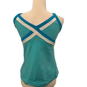 Lululemon Power Y Cross-Back Tank Top, Teal Blue, Built In Bra, Size Small. Tank with striking cross over strap design. Features a teal blue body with cream and turquoise trim, creating a bold crisscross detail at both front and back. Built in shelf bra for light support, perfect for yoga, Pilates, barre or casual wear. Smooth, stretchy performance fabric that wicks moisture and moves with you. Excellent condition.
