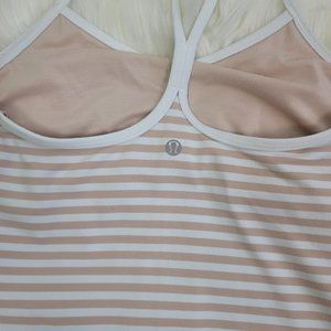 Lululemon Power Y Tank Top in a tan and white striped print. Built in shelf bra, cup pads not included. Full length. Great condition.