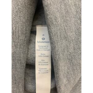 This Lululemon Press Pause Pullover Sweatshirt in Medium Grey is made of a comfortable cotton blend terry fabric with a high neck and long sleeves for warmth. It features a pullover closure style with a classic Aladdin logo accent on the front. The sweatshirt has a size 8 and includes convenient pockets for storage, making it suitable for casual activewear occasions.