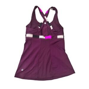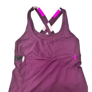 Stylish and functional Lululemon Athletica tank top with a built-in bra and cross-back strap design. Comes in a deep purple color with contrast pink/white/black strap details. Perfect for yoga, gym sessions, or casual athleisure wear.