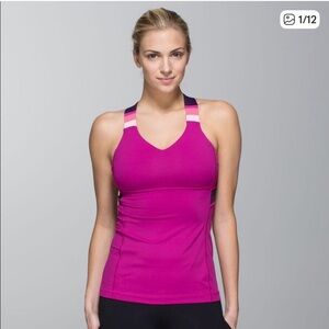 Push Ur Limits Tank Top in in Raspberry / Assorted Stripe Bleached Coral. Size 6. Built in shelf bra, in EUC. No rips stains holes or piling. Padding for she,f bra is included. Hardly worn, I have lots of other Lululemon in separate listings, bundle and save. .