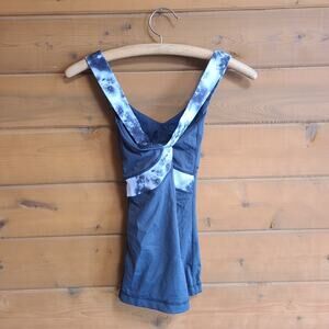 Great basic workout tank with cute detail straps. Is a charcoal gray color. Photos taken in natural light add a tiny bight of brightness. Great pre-loved condition.