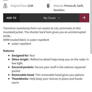 Transition seamlessly from run routes to city commutes in this insulated jacket. The shorter back hem gives you an uninterrupted stride.