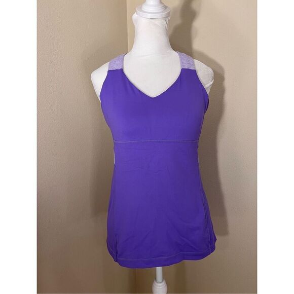 Purple tank top with purple micro stripe accents. The thick racerback straps are supportive and allow for complete freedom of movement. Built in shelf bra with pockets for removable cups (not included). Color way is called Power Purple/Power Purple Microstripe.