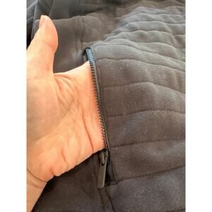 Thicker sweatshirt fabric.  Side zippered pockets.  Snaps at neck.  Full zipper closure.  Collar can be worn up or down.  Light wash wear and fading that is typical of this fabric.