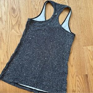 Lululemon racerback tank. No size dot but I think it is an 8 (I am original owner) worn with plenty of life. Black and white speckles