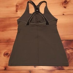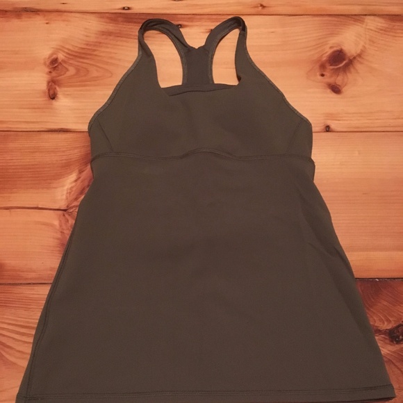 NWOT Racerback tank by Lululemon. Worn once and in perfect condition. This is a size 6 but in Lululemon sizing that corresponds to a S/4. Sturdy design that gives lots of support, with (optional padded) built in bra. Color is olive green with some patterning on the back panel. Great top, just not my color! I foolishly took the tags off and can't return. Make me an offer!