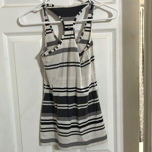 Lululemon Racerback. Grey black and white. Form fitting but lots of stretch; very slimming. Size tag ripped out but I believe it’s a 4