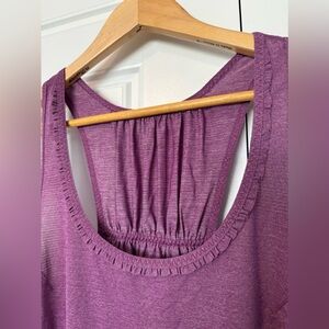 Lululemon racer back tank with ruffle detail. Tag has been cut out but women’s size 8, if I recall. Please see pictures with approximate measurements to be safe. Excellent used condition, no stains or rips.