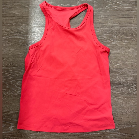 Lululemon racerback tank in a bright pink/orange color. Worn about 3 times and in great condition. Unfortunately I ripped the tag off, although I’m almost positive it’s a size 8 (price reflects no tag)