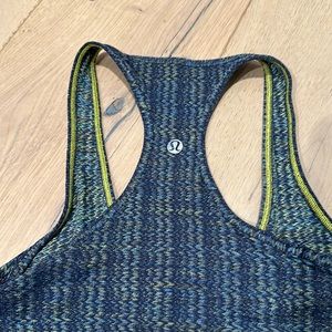 Lululemon Racerback Tank. Size 2. Have had it for awhile but only wore it 2 times, so it’s like new. A muted design with navy, yellow and green as the color combination.
