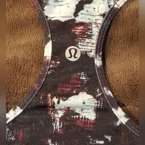 Stylish Lululemon racerback tank top with an abstract print. Features a mix of black, white, and red colors. Soft Lightweight fabric that stretches. In really good condition. PTP 13, Waist 13.5 Length 26 No tags. Perfect for casual wear. Or yoda, running, biking and any. actively. Size xs/sm?