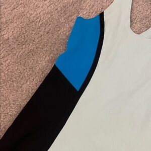 Stylish racerback tank top with a colorblock design. Features light blue, black, and blue panels.