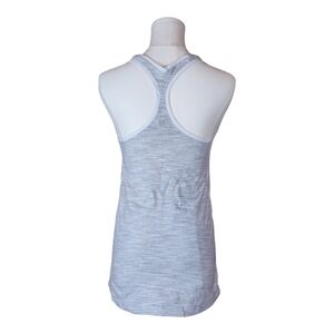 This Lululemon women's racerback tank top is a lightweight, breathable athletic top perfect for workouts, yoga, or casual wear. It features a subtle heathered stripe pattern in light gray and white, giving it a sleek and modern look. The racerback design allows for a full range of motion, while the Lululemon logo on the upper back adds a signature touch. The fabric is likely a blend of moisture-wicking materials, ensuring comfort during high-intensity activities however there is no material tag.