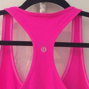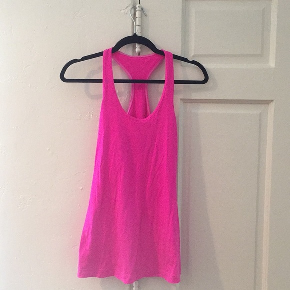 Bright pink lululemon athletic racer back top! Tagless but size M when purchased. Soft, fitted, comfortable material and in great used condition. No damages!
