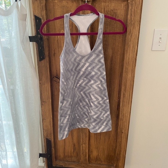Grayish zig zag Lululemon Racerback tank top. No size tag. 27” long, 13” bust, 16” hem width.