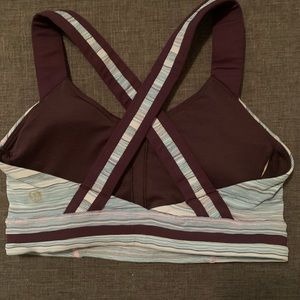 Lululemon rack pack bra with pockets to store things while you are active. Pretty lilac, indigo, and navy stripe print. Size 4 and in amazing condition. Barely worn! Cups included!