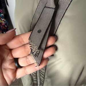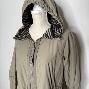 Lululemon Rain For Daze Jacket in Soft Earth/Narrow Bold Stripe Printed Soft Earth Black. Reversible. Zipper pull tab is fraying, refer to photo. Otherwise good used condition!