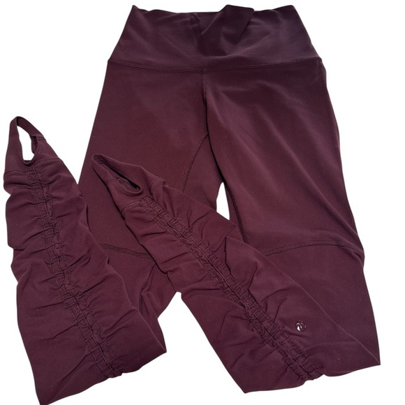 Stylish dark burgundy leggings with ruched details. Perfect for workouts or casual wear. Stirrup bottom. In great shape. Size 6
