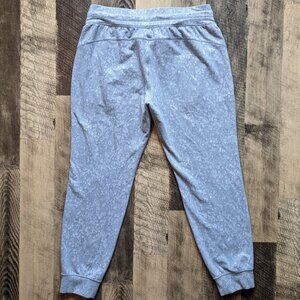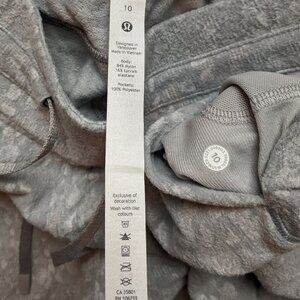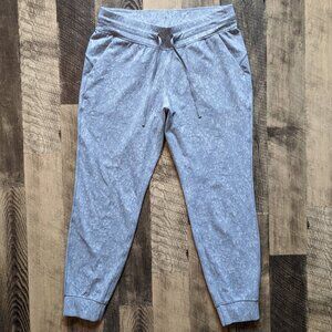 These are Lululemon Ready to Rulu Joggers in the colorway Speckle Spritz Jacquard Rhino Grey Silver Drop Starlight. They are in excellent condition. They are a size 10, and the last two images show measurements. Soft, sweat-wicking, breathable Rulu fabric with four-way stretch. Pull-on style with drawcord closure, high rise, front slash pockets.