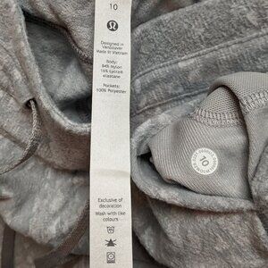 These are Lululemon Ready to Rulu Joggers in the colorway Speckle Spritz Jacquard Rhino Grey Silver Drop Starlight. They are in excellent condition. They are a size 10, and the last two images show measurements. Soft, sweat-wicking, breathable Rulu fabric with four-way stretch. Pull-on style with drawcord closure, high rise, front slash pockets.