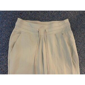 These Lululemon joggers are in good condition with no holes or excessive wear. There are some marks on the end of the drawstring which is shown in the photos. When laying flat, measurements are as follows: