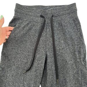 These Lululemon joggers offer a tailored yet relaxed fit, combining a soft heathered material with functional details such as a drawstring waist and ribbed cuffs.