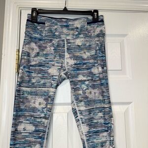 Size Womens 6. White crop capri length leggings with blue purple black and yellow blurry stripe pattern. In great condition, slight cracking on the logo as shown. Material tag was ripped out. Size dot in the back zipper pocket.