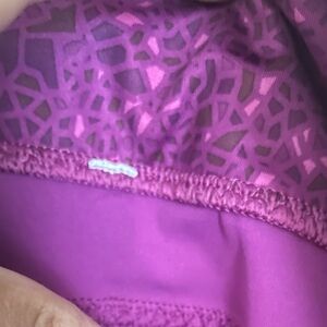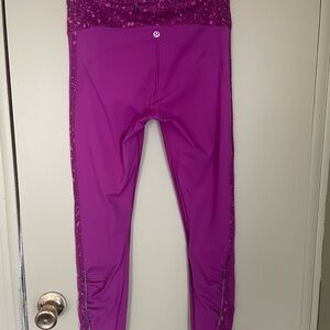 Stylish Lululemon leggings in a vibrant purple pattern. Perfect for workouts or casual wear. Size tag is missing, but tagged a 6 brand new condition. Has the scrunched leg at bottoms. Jelly hit is perfect. Has back zipper pocket and a small front waistband pocket. Absolutely perfect.