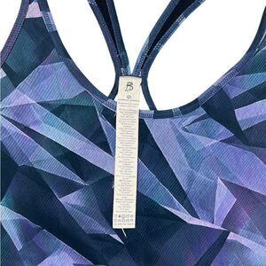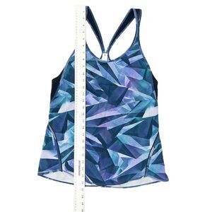 Super cute pre-owned Lululemon Real Quick Singlet Tank Top, Size 6. Print is Pretty Prism Multi, a purple and green geometric print with black mesh side panels. Rip tag still intact. No stains or holes. Please ask all questions before purchasing.