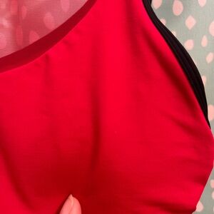 sports bra, red and black, moisture-wicking, athletic wear, mesh detail, fitted, workout top, breathable fabric, casual active, minimalist style