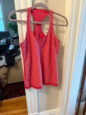 Lightweight racerback tank in a heathered red fabric. Soft, stretchy material with a classic scoop front. Great for workouts or casual wear.