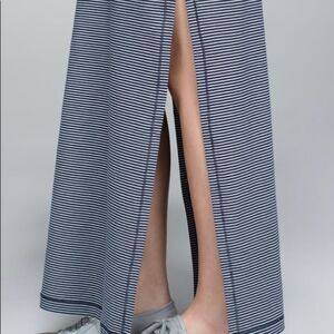 Refresh Maxi Dress in Hyper Stripe Inkwell from Lululemon. Made from Vitasea fabric made from a blend of Pima Cotton and high stretch Lyra fibre. Wide racerback cut. High slits for wide strides. No size tag but appears to be size 2 based on measurements and size chart. Approximate flat lay unstretched measurements- Bust: 12” across from armpit to armpit. Waist: 11.5” across. Length: 53”. Gently preowned condition with no tears or stains.