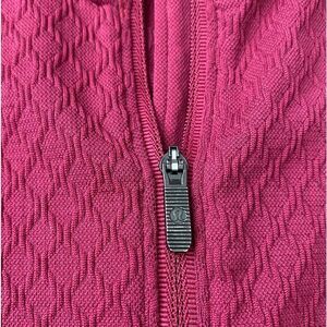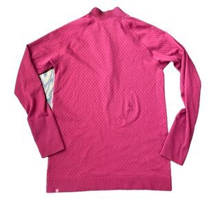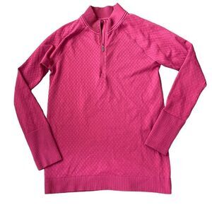 Lululemon Rest less 1/2 Zip Ruby Star pullover. The size tag is missing, but the size dashes indicate that it is a 10. The shirt is pre-owned and there are no stains. Minor wear/pilling. There is a small hole on the back of the shirt (see last photo), reflected in price.