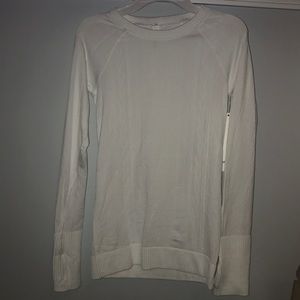 White long-sleeve layer perfect to keep warm. Fabric is stretchy and soft. Slim fit, hip length. Thumb holes.