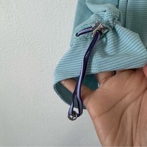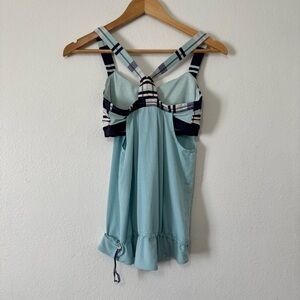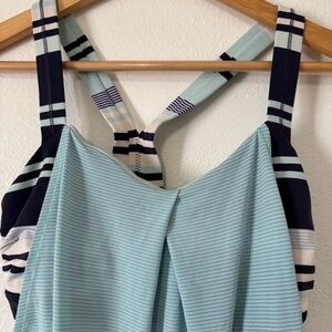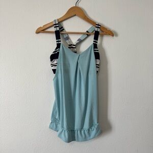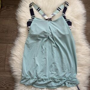 We designed this lightweight tank with sweat-wicking fabrics and a breezy fit to help us keep our cool in the gym. The medium-support, medium-coverage bra keeps our ladies secure and the drawcord at the waistband helps keep our top in place so we're covered from burpees to box jumps.
