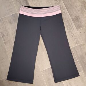Lululemon Reversible Clam Digger Gray/Pink Crop, pink and gray stripes on waistband and reverse is all black. No tag just size circle. Second pic is for fit only, all others are actual pant and in good gently worn condition. Lots of life left. Grest color combo and no flaws. Inseam is 19"